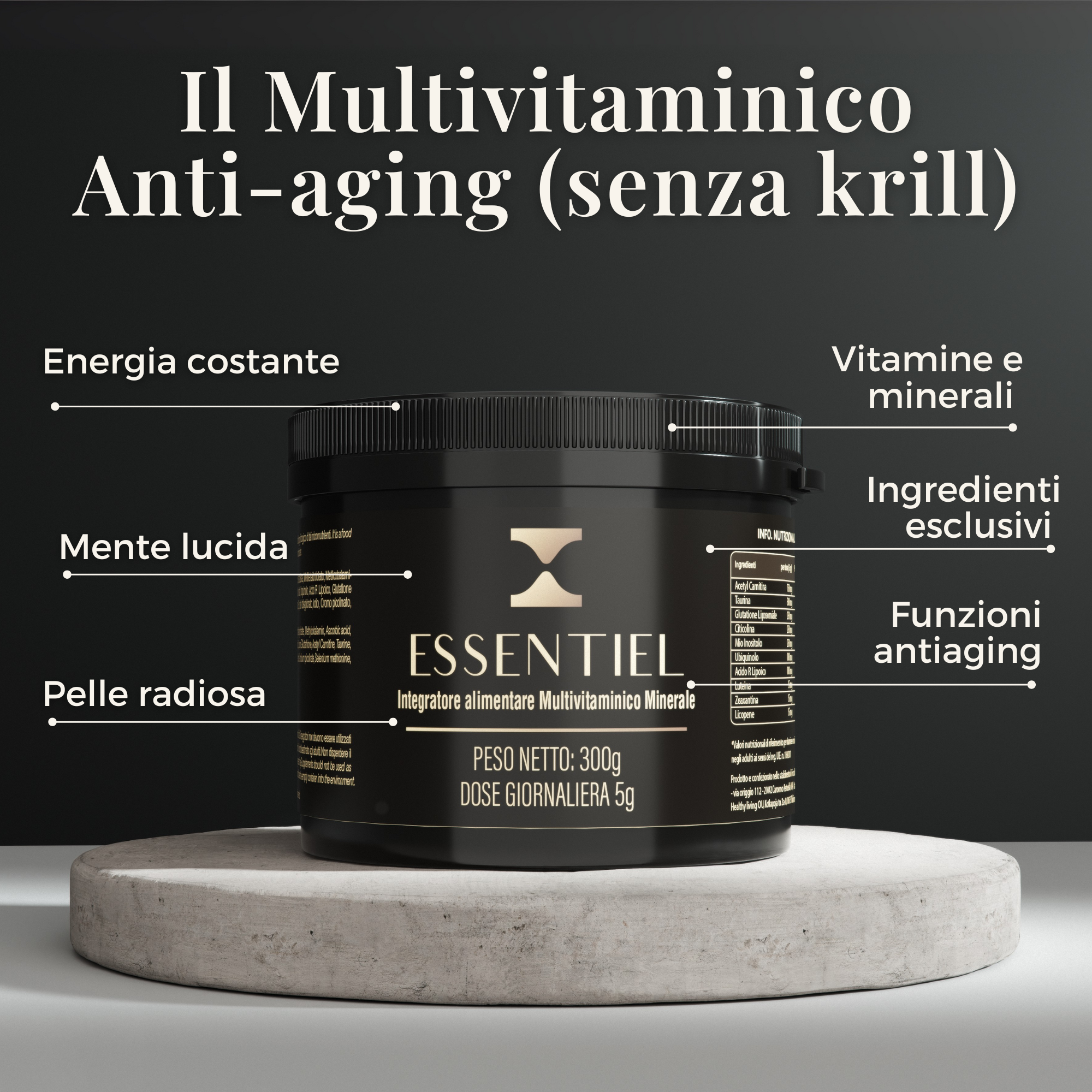 Dentro Essentiel puoi trovare vitamine e minerali per un supporto totale e ingredienti esclusivi per funzioni antiaging e specifiche.